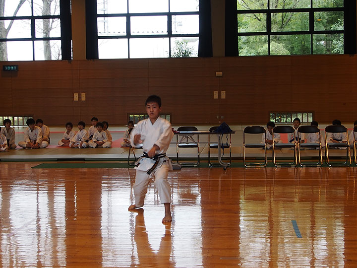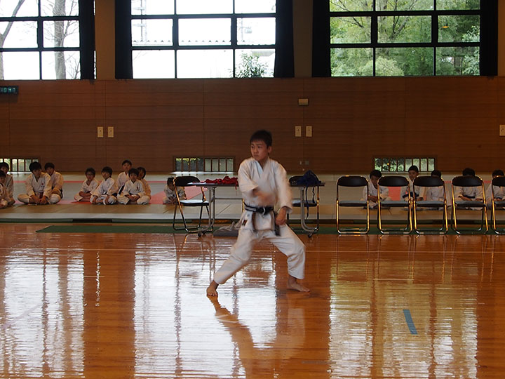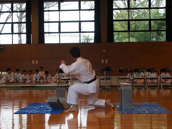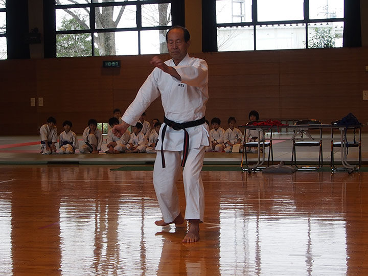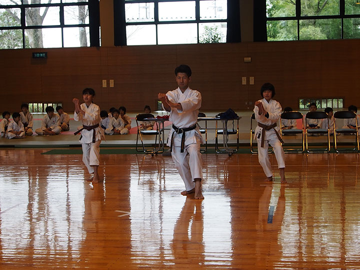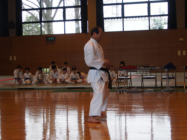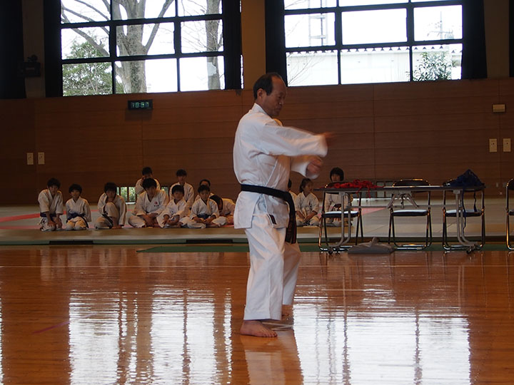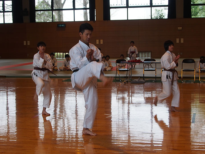 次第 形団体戦(4班優勝) 組手団体戦(1班優勝)親子演武(全日本空手道連盟第二指定形:二十八歩(ニーパイポ)) 松涛館流形演武:燕飛(エンピ) 試割り:中澤指導員 試割り:宮寺指導員補 卯野宗家 形演武:五十四歩(ゴジュウシホ) 模範組手演武 懇親会 記念品贈呈